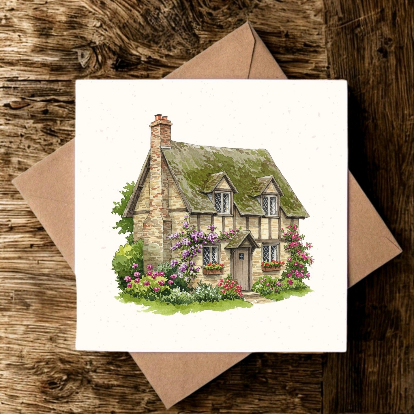 This beautiful greeting card features a watercolour illustration of a quaint, country cottage called "Meadow View Cottage" on the front. The inside is left blank so you can write your own personal message.